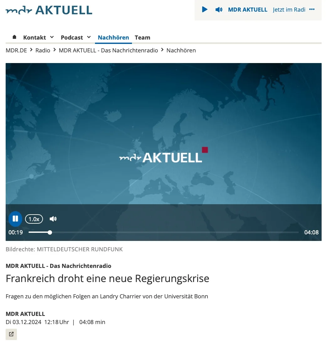Dr. Landry Charrier im MDR-Nachrichtenradio über die drohende Regierungskrise in Frankreich Bild 04.12.24 um 12.31.webp image/webp Typ image/webp Dimension Abmessungen 1040x1138 Size Dateigröße 47.8 KB Herunterladen Bild in voller Größe anzeigen…